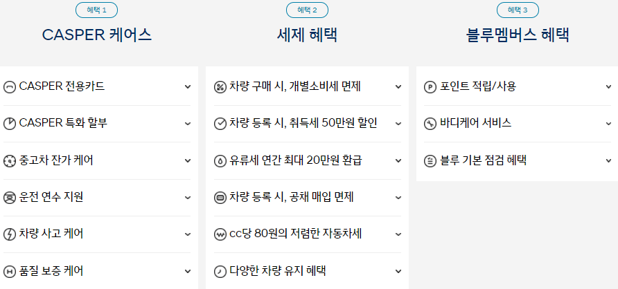 캐스퍼 온라인 구입시 다양한 세제혜택과 포인트, 서비스를 제공합니다.