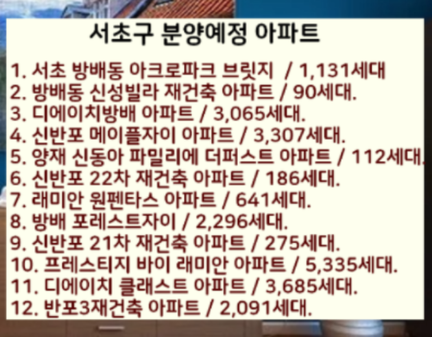 또한 서울 서초구에서만 분양예정되어있는 아파트도 남겨드리니 확인하시기 바랍니다.