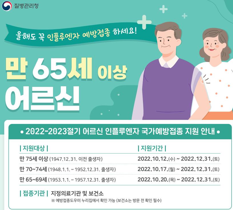 2022년 12월31일까지는 만65세 이상 어르신이 독감예방접종 시기입니다.