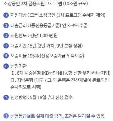 코로나로 피해입은 2차 금융지원 프로그램으로 6개 시중은행과 지방은행에서 신청가능합니다.