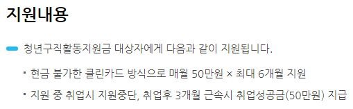 청년 구직활동 지원금 매달 50만 원씩 6개월까지 지원받을 수 있으며 송금 불가한 클린카드 방식으로 지원해 준다고 합니다. 물론 지연 기간 중에 취업을 할 시에는 구직활동지원금이 중단됩니다.