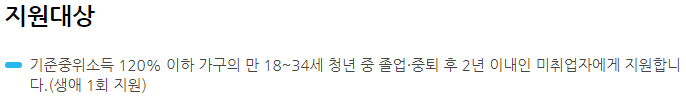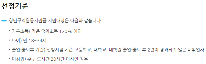 청년구직활동 지원금 선정 기준은 기준중위소득 120% 이하이며 나이는 만 18세에서 34세의 신청하실 수 있습니다. 미취업 대상자가 신청하실 수 있으나 주 근로시간이 20시간 이하인 경우 아르바이트생도 구직활동 지원금을 신청 하실 수도 있습니다.