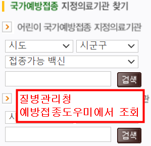 또는 홈페이지 메인화면에서 가운데쪽에 국가예방접종 백신별로 지정의료기관을 찾을수있습니다.