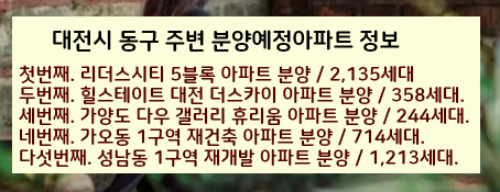 또한 대전시 동구에 분양예정인 다른 아파트들도 정리해놔으니 확인한세요.