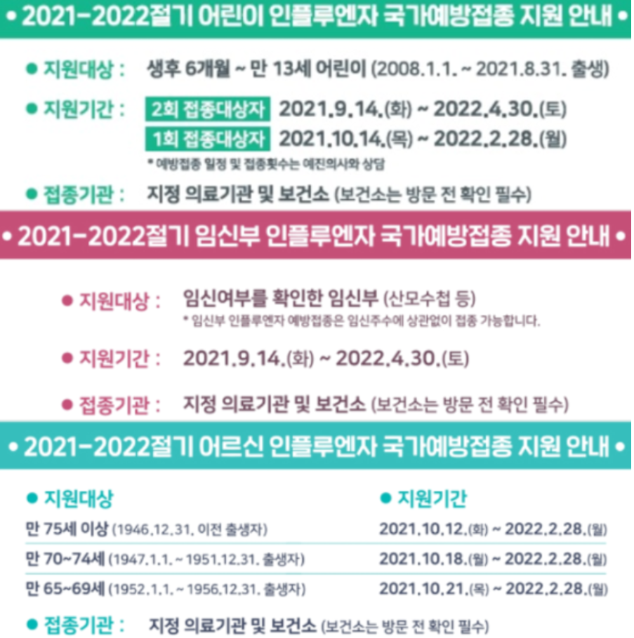 독감 무료접종 대상자별로 예약 및 신청일정을 확인하시기 바랍니다.