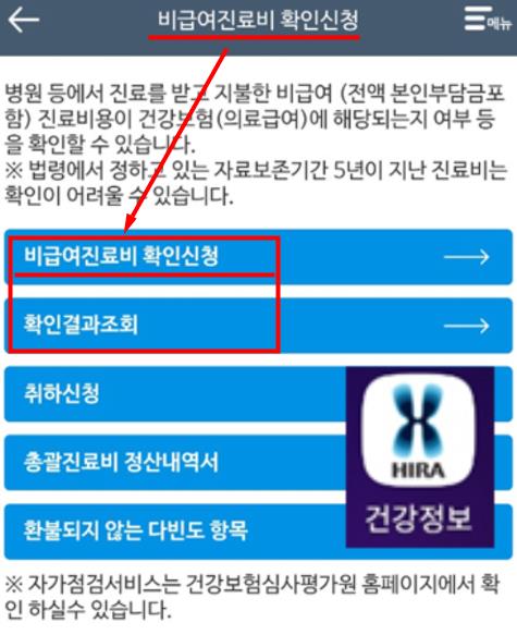 첫번째. 건강보험심사평가원 홈페이지에 접속해서 '비급여진료비 확인신청'을 선택합니다.
