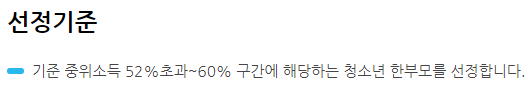 한부모 고교생 교육비 지원 선정기준은 기준중위소득 52% 초가 60% 구간에 청소년한부모를 선정한다고 합니다.