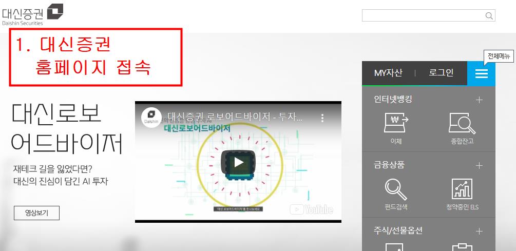 첫번째. 대신증권 홈페이지에 들어가서 처음 화면을 띄웁니다.