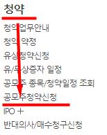두번째. 왼쪽에 파란색으로 '전체메뉴'표시가 있은데, 이곳에 공모주 IPO 소메뉴들이 몰려있습니다.