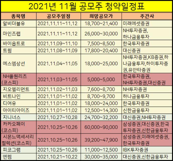 2021년 11월 신규상장 주식들의 청약일정표도 첨부했으니 확인하시기 바랍니다.