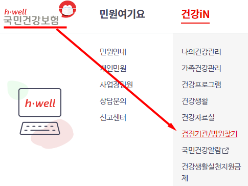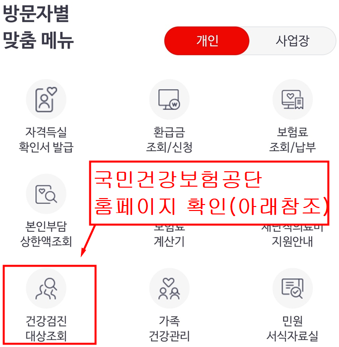 홈페이지에 들어가시면 초기화면에 '건강검진대상조회'라는 메뉴가있습니다.