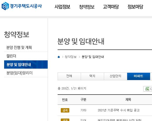 두번쨰. 경기도 아파트 공공분양과 공공임대아파트 분양공고를 확인할수있습니다.