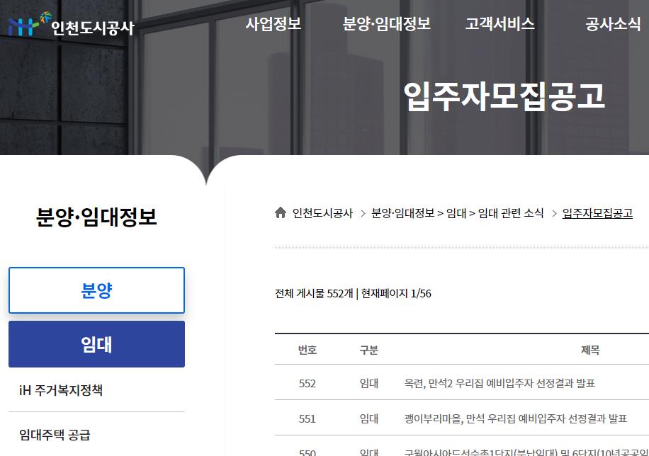 3. 인천 공공임대아파트 분양공고는 인천도시공사에서 확인.