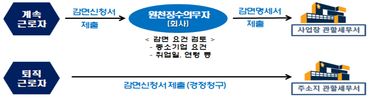계속근로자 / 퇴직근로자별로 소득세 감면신청서 관할세무서가 다릅니다.
