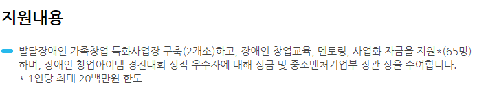 장애인 창업육성 지원사업은 발달장애인 가족창업을 특화사업장으로 2개소 구축을 지원해주고 장애인 창업교육과 멘토링, 사업화 자금을 지원해줍니다. 또한 장애인 창업아이템 대회 성적 우수자는 상금과 중소벤터기업부 장관상까지 준다고 합니다.