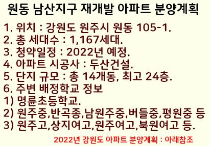 2022년에 원동 남산지구 재개발아파트처럼 원주시에서 분양예정인 아파트들을 알아보겠습니다.