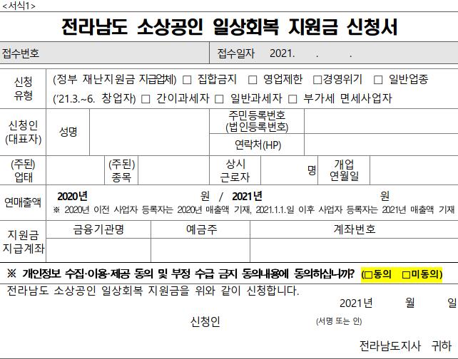 아래 전라남도 소상공인 일상회복 지원금 신청서 양식을 첨부하였습니다.