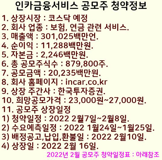 인카금융서비스 공모주 청약일정은 2022년 2월7일부터 8일까지입니다.