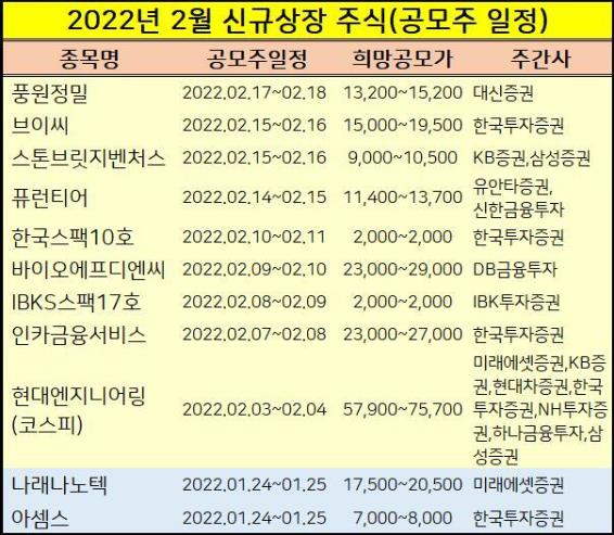 2월에는 유독 신규상장 공모주 주식들이 많습니다. 풍원정밀, 브이씨, 스톤브릿지벤처스, 인카금융서비스, 현대엔지니어링 코스피 상장주도 있죠. 아래 2022년 2월 공모주 청약일정, 수요예측일