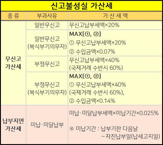 아래 신고불성실해서 무신고하거나 과소신고 납부지연시 내는 가산세를 참고하세요.