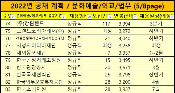 2022년 공기업 공채중에서 문화예술, 외교, 법무분야 채용계획입니다.