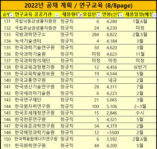 마지막으로 연구교육분야 공공기관에서 2022년 공채 일정입니다.