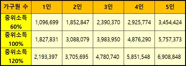 아래 중위소득 60%, 100%, 120%를 표로 정리해놨으니 확인하세요.