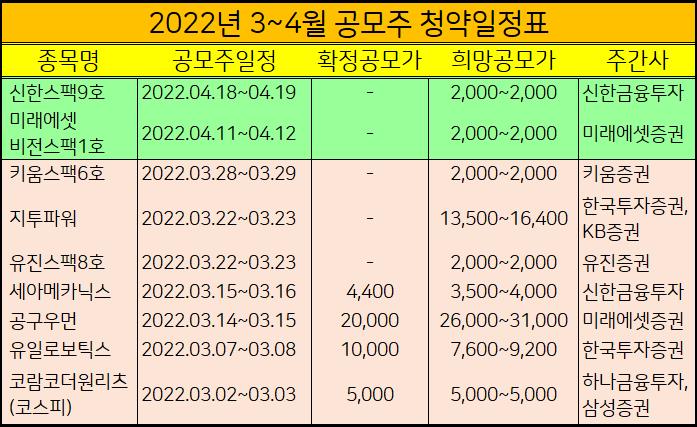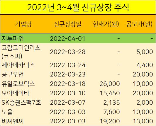 2022년 3월에 신규상장하는 상장 주식 10개를 표로 정리했습니다.