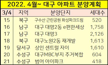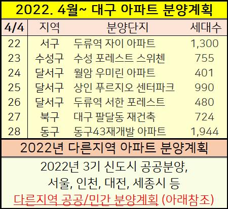 2202년 4월이후 대구 분양예정 아파트들을 정리했습니다.