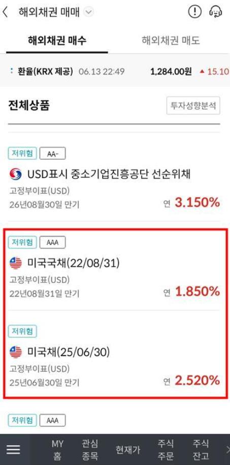 은행마다 매매할수있는 미국 국채 종류가 다 다릅니다.