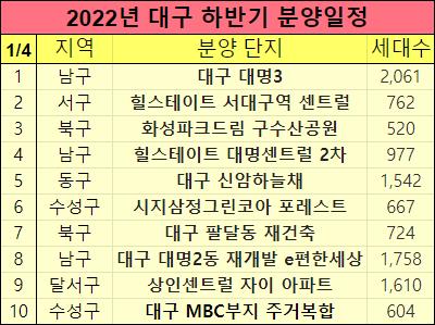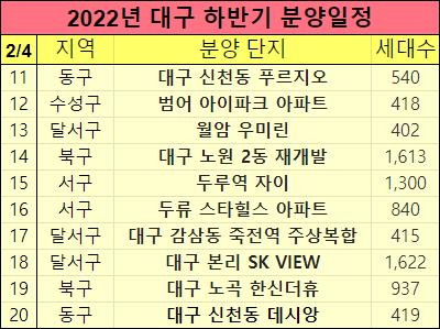 2022년 대구 하반기 아파트 분양일정을 표로 정리해서 알려드렸습니다.