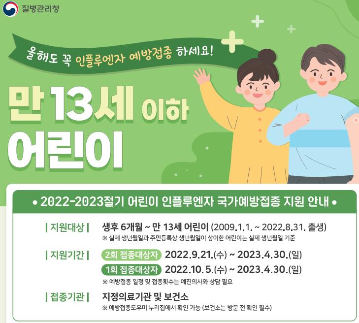 1. 어린이 독감예방접종 시기 : 2022.9.21.~2023.4.30.