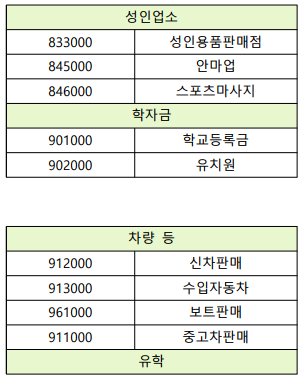 결혼 예식장이나 혼수전문점은 사용처가 아니며 제한업종입니다. 돈놓고 돈먹는 다음과 같은 사항에도 사용하면 안됩니다.