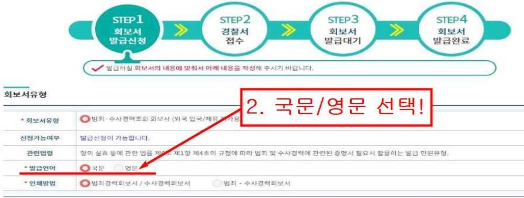 영문 범죄기록증명서는 '발급언어'에서 '영문'을 지정하셔서 신청해야합니다.