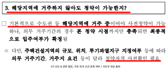 많은분들이 궁금해하는 사항으로 3기 신도시 사전청약 지원시 해당 지역에 거주해야하는지 여부입니다. 결론부터 말씀드리면 "예, 그렇습니다." 기본적으로 수도권 등 청약을 신청하려는 해당 공공분양 및 임대의 위치한 지역에 거주중이어야 사전청약이 가능합니다.