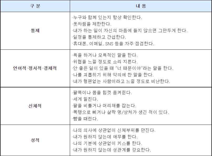 3. 정서적 폭력 : 폭언과 욕설, 무시와 통제, 감시와 협박, 자해, 스토킹 등.