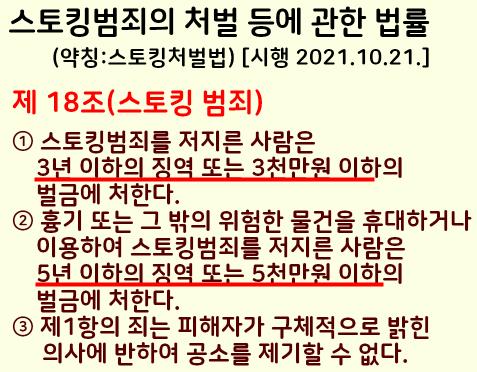 '스토킹범죄의 처벌 등에 관한 법류' 제 18조 스토킹 범죄에 관한 법률입니다.