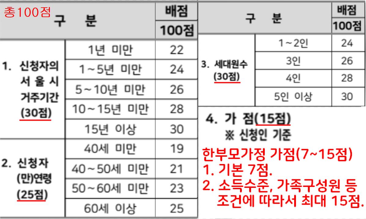 아래 임대주택 점수표(100점)에서 자신이 몇점인지 확인하세요.