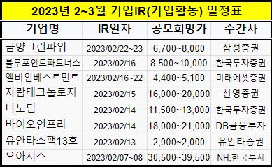 이렇게 2023년 2월에 신규상장 일정표를 올려드렸습니다.