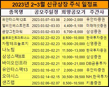 2023년 2월에 신규상장하는 주식들을 표로 만들었습니다.