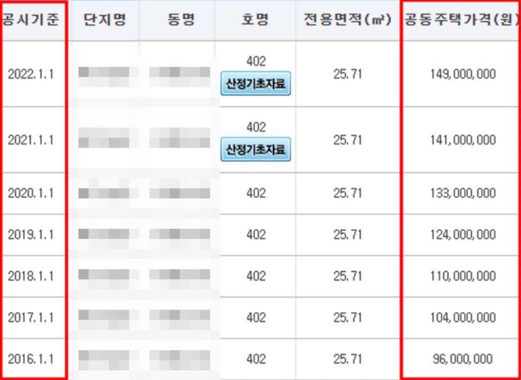 다섯번째. 아파트 단지명과 동, 호수별로 공시가격이 표시됩니다.