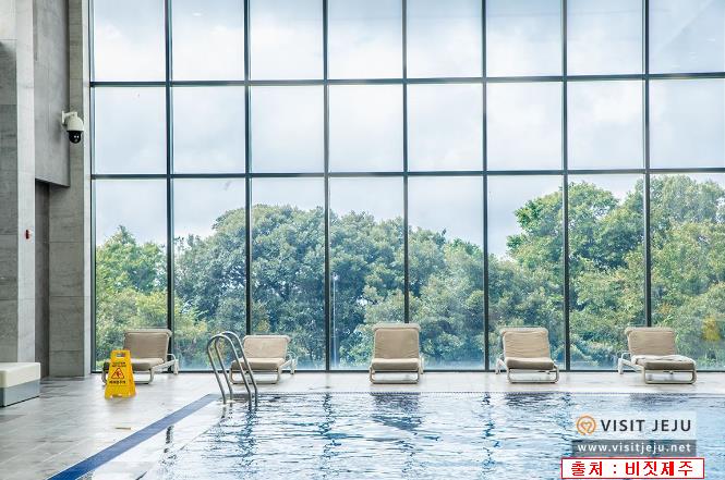 유리창 밖으로 제주 비경을 구경할수있는 수영장과 노천 온수풀이 있습니다.