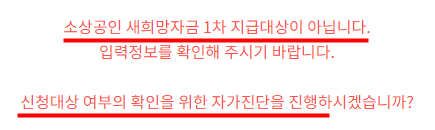 2차 지급 대상자의 경우에는 사이트에서 "소상공인 새희망자금 1차 지급대상이 아닙니다."라는 메세지를 받으분들이 아셔야합니다. 아래처럼 소상공인 1차 지급 대상이 아니라고 창이 뜨면서 신청 대상 여부 자가진단 페이지로 자동으로 이동합니다.