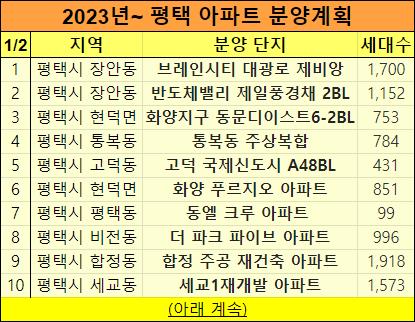 2023년 평택 아파트 분양계획을 표로 정리했습니다.