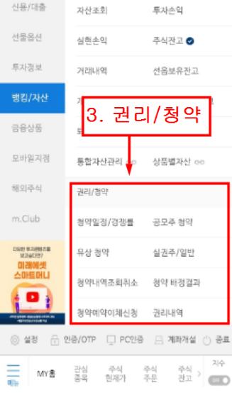 두번째. 뱅킹 및 자산메뉴에 들어가서 권리청약 옵션을 찾아야합니다.