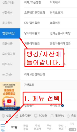첫번째. 미래에셋증권 앱에서 왼쪽하단의 메뉴를 선택합니다.