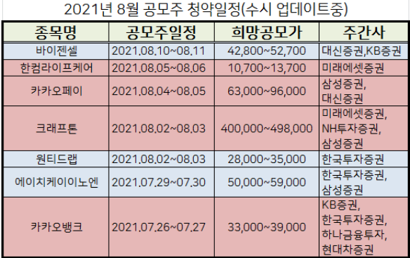 7월 신규상장 주식들의 청약일정을 표로 정리하였습니다.