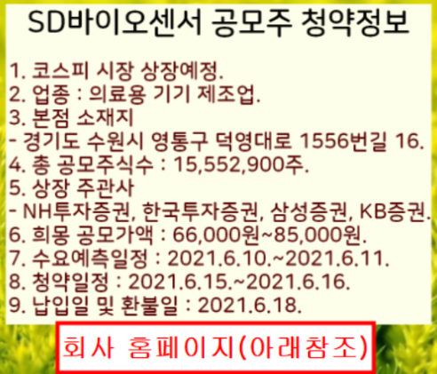 오늘은 이렇게 에스디바이오센서 공모주 청약일정을 소개해드리면서 상장일, 공모가, 상장 주관사, 수요예측일정까지 전반적으로 청약 핵심정보를 상세히 설명드렸습니다.