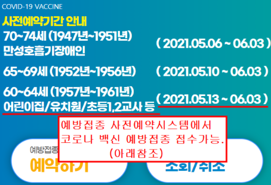 코로나 예방접종 예약 홈페이지(어린이집, 유치원, 초등학교, 60세 이상 노인)