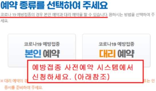 홈페이지에서 '예약하기'를 선택하시면 '본인예약'과 '대리예약'이 있습니다.